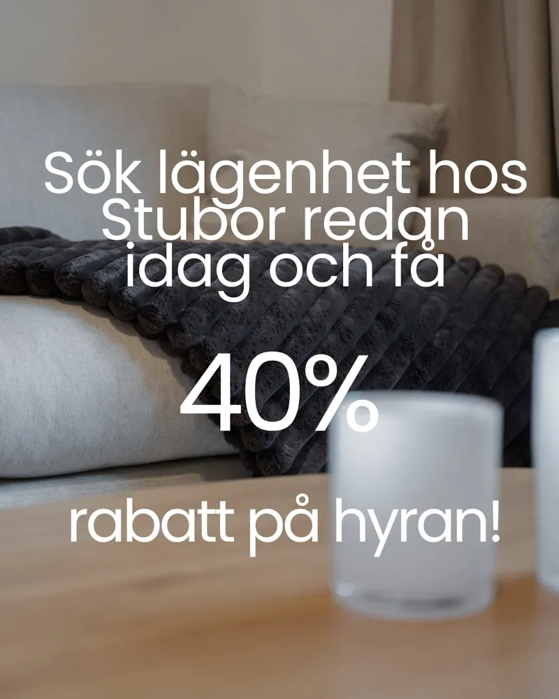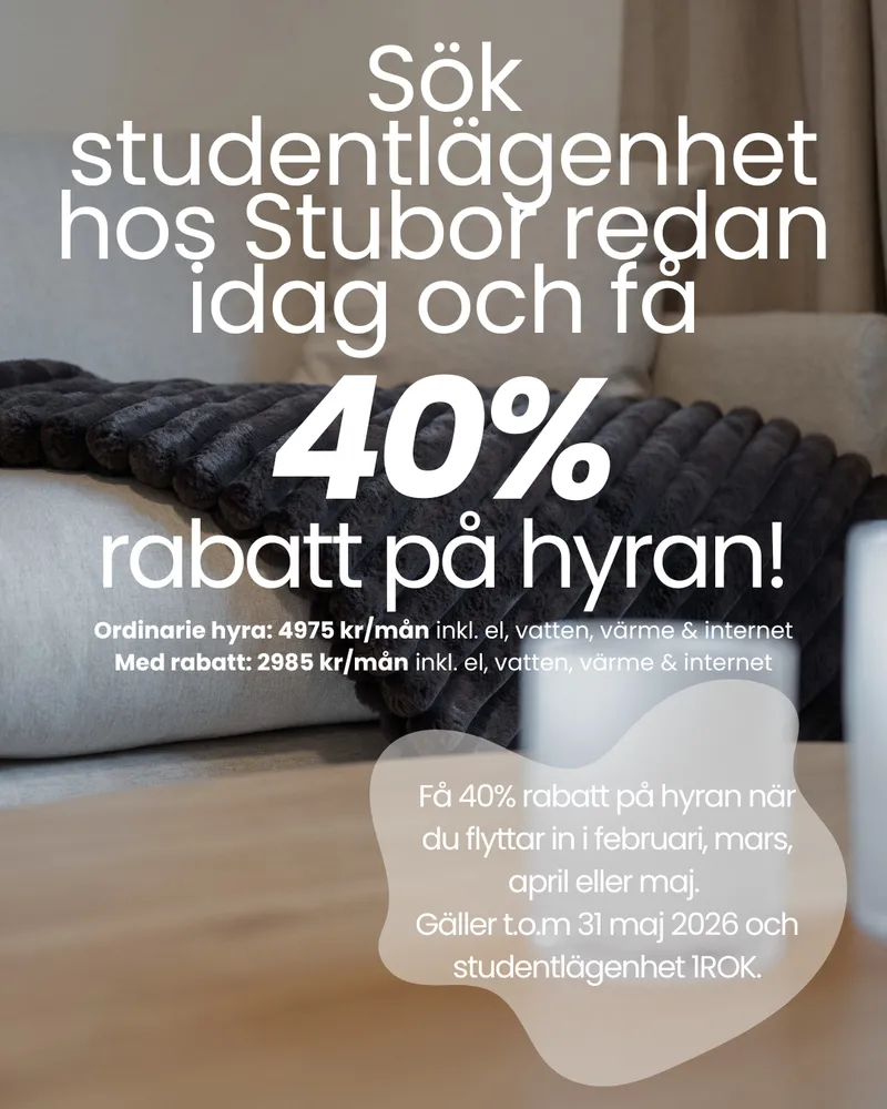 40% rabatt på hyran för studentlägenheter med inflytt från 1 februari. Sök studentlägenhet redan idag!