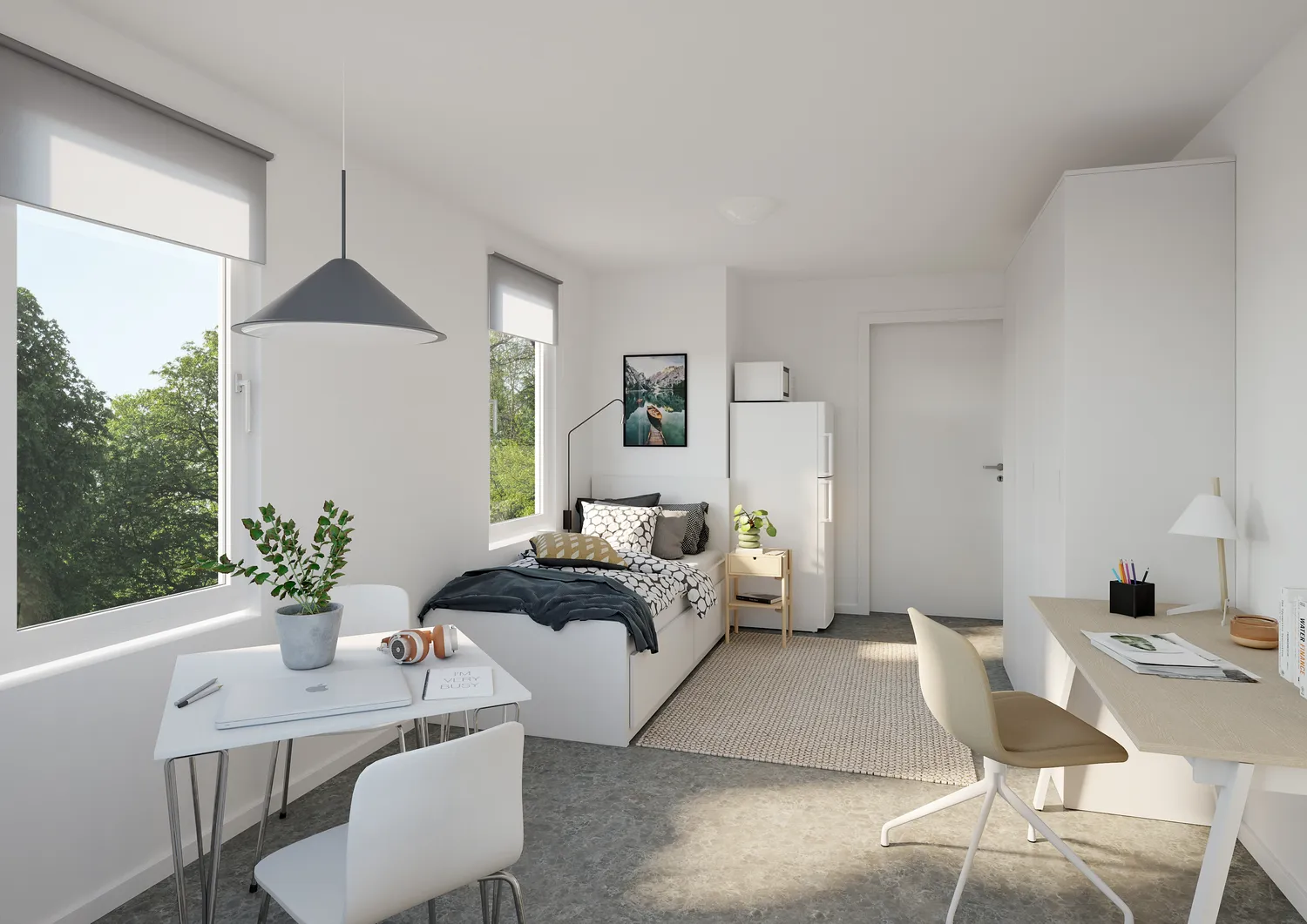 - Möblering i form av säng, sängbord, bord med stolar, garderob, kyl, frys och mikrovågsugn i rum.